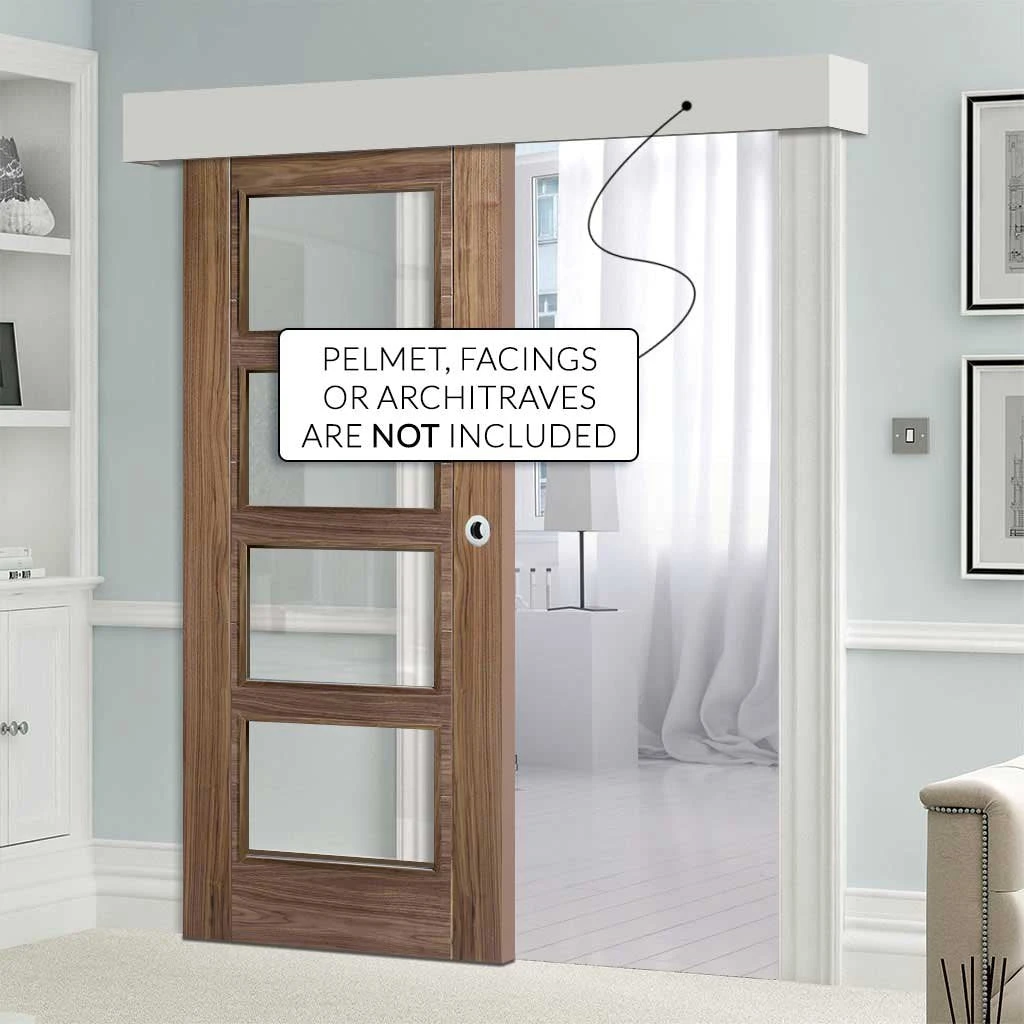 Bespoke Thruslide Surface Vancouver Walnut 4L Door - Clear Glass - Sliding Door And Track Kit - Prefinished -LPD Door pelmet graphic vancouver walnut glazed sliding thruslide surface internal directdoors