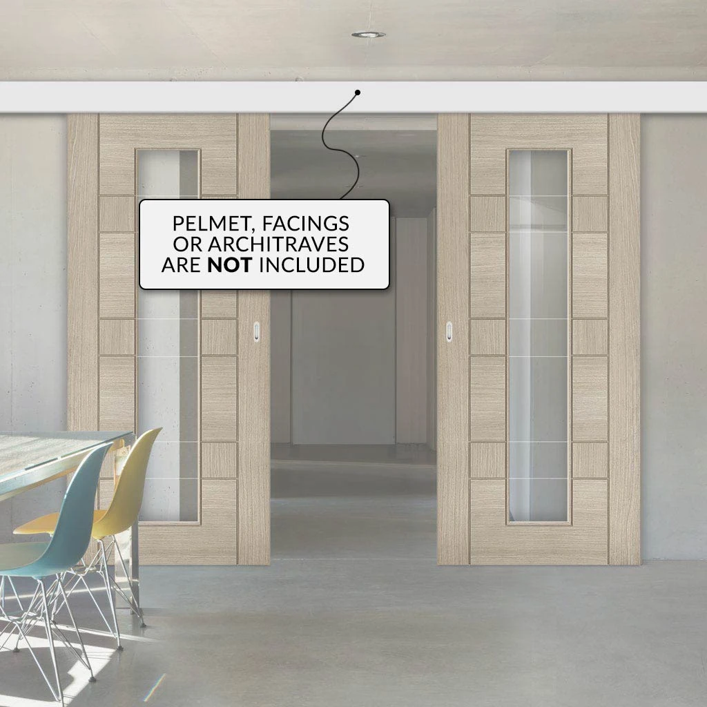 Price: Includes track, guides, track stops, soft close mechanism, main screws/fixings, but does not include any architrave extension plates to carry the track or any pelmet top and face.