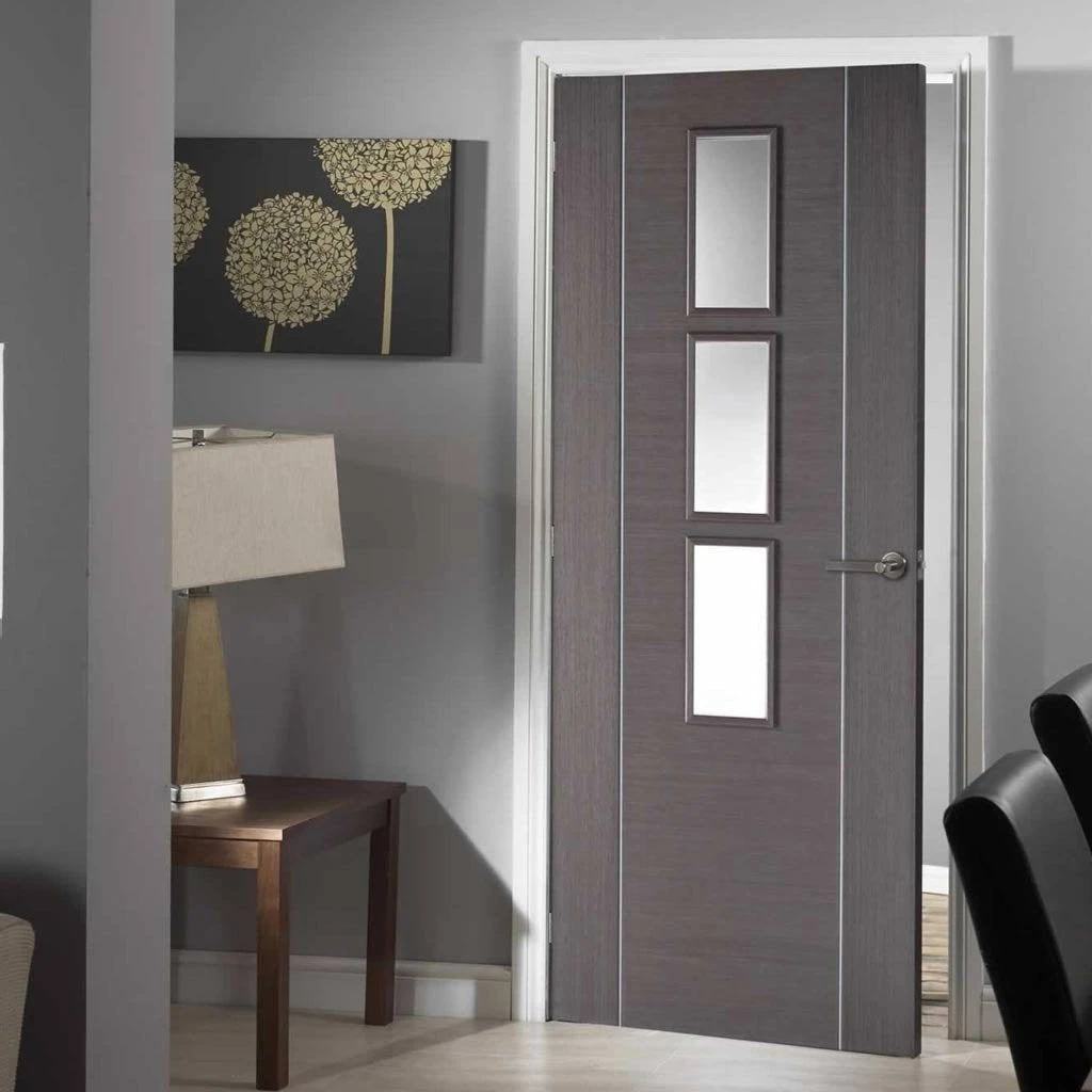The items making this kit are a mix of unfinished oak and prefinished Chocolate grey veneer, the door is a prefinished (FULLY DECORATED) Chocolate grey painted veneer, the frame and architraves are oak without decoration but can be painted to compliment the door.