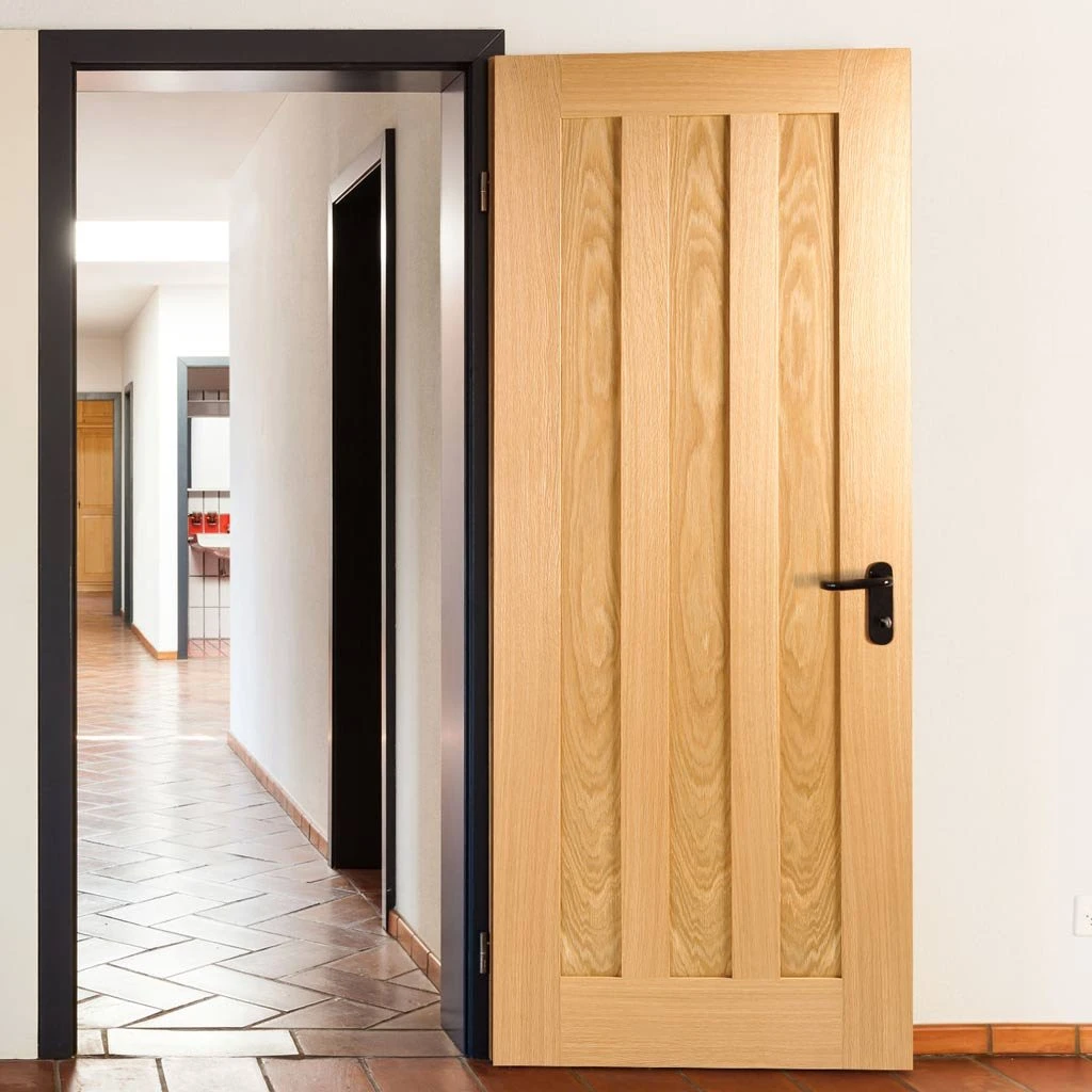 The items making this kit are a mix of unfinished oak and prefinished veneered oak, the door is a prefinished (FULLY DECORATED) oak veneer, the frame and architraves are oak without decoration but can be stained to compliment the door.