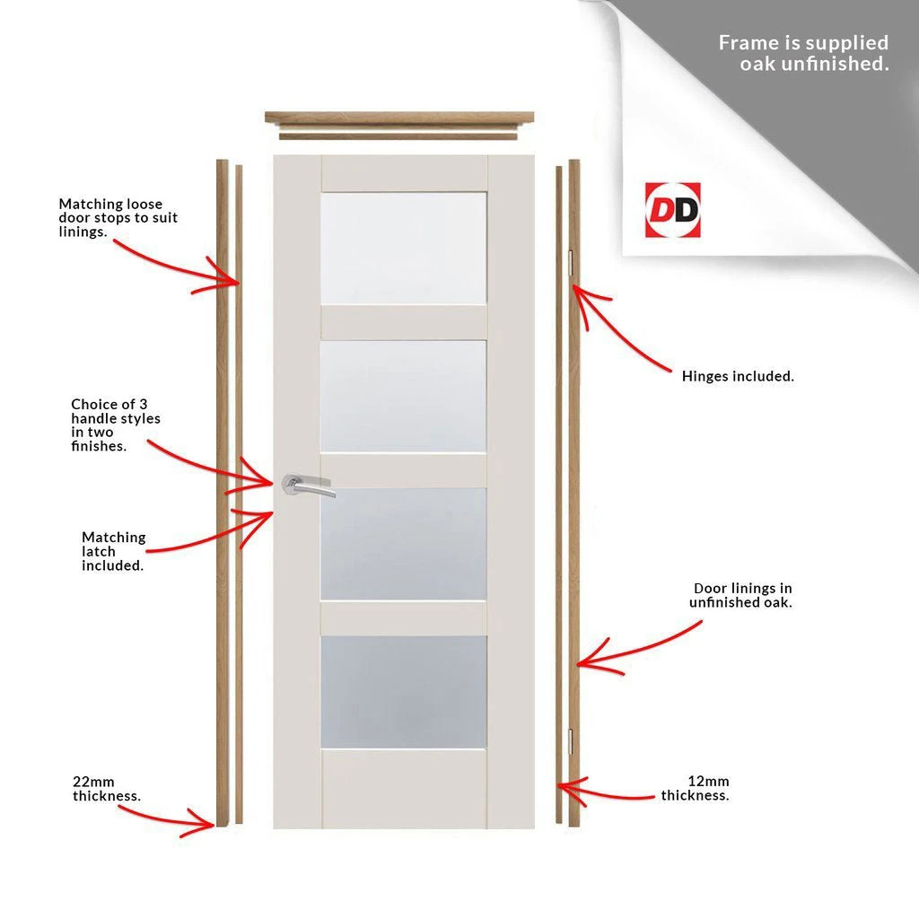 The items making this kit are a mix of unfinished oak and prefinished white painted mdf, the door is a prefinished (FULLY DECORATED) mdf veneer, the frame and architraves are oak without decoration but can be painted to compliment the door.
