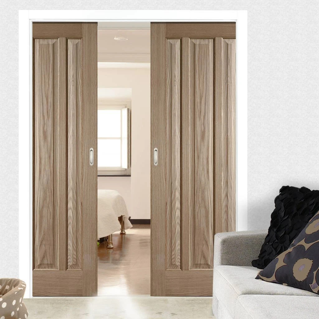 Our all new Ermetika interior double pocket door systems have a free delivery as standard, these pocket doors come with full fitting instructions and the door system allows you to slide the doors straight in to a cavity in a preformed wall aperture, the system incorporates a galvanised steel cassette section and a track set with all fittings, soft close is also included. The door may be supplied with full decoration but no decor is included to the cassette system parts or its frame, check each door as you browse for the exact details.