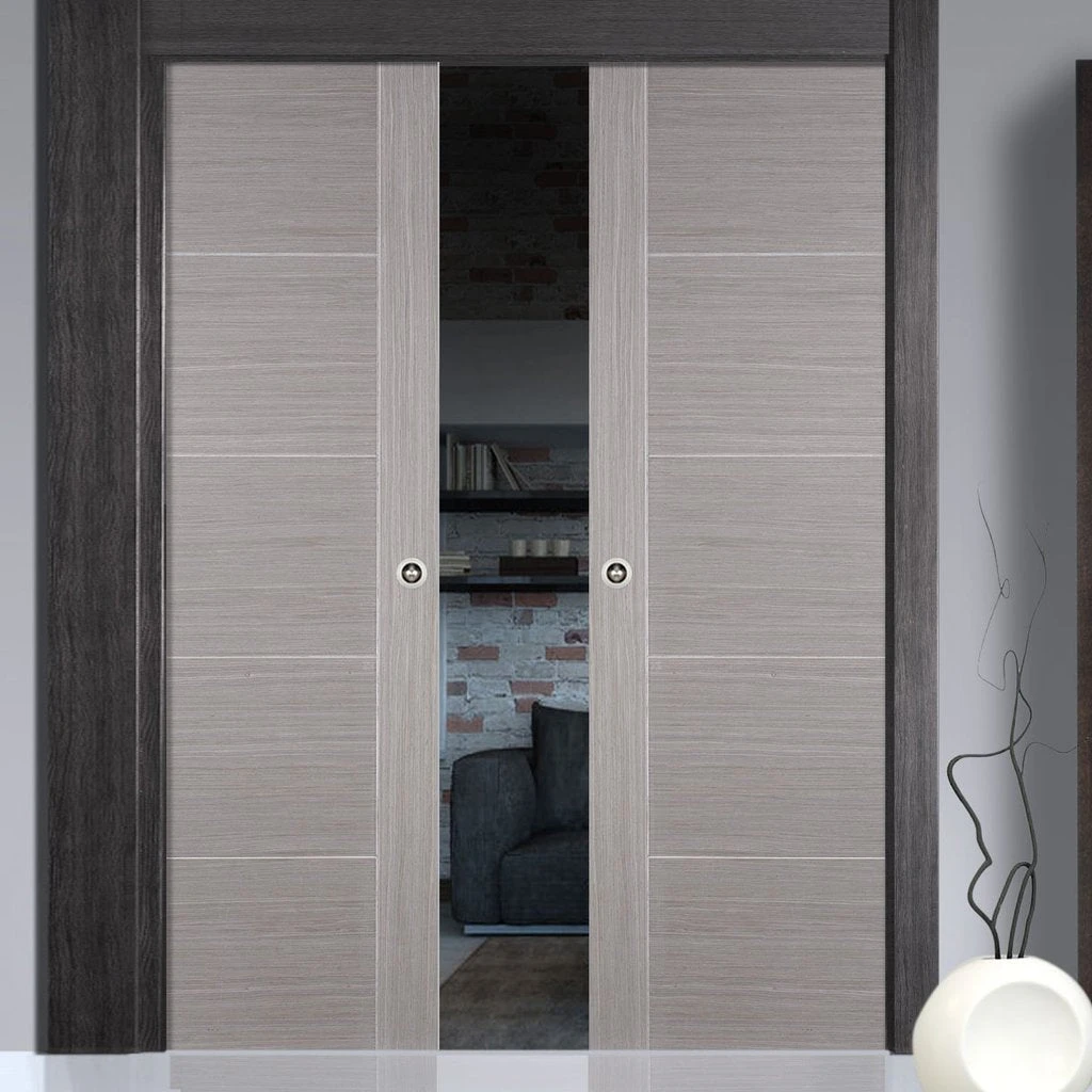 Our all new Ermetika interior double pocket door systems have a free delivery as standard, these pocket doors come with full fitting instructions and the door system allows you to slide the doors straight in to a cavity in a preformed wall aperture, the system incorporates a galvanised steel cassette section and a track set with all fittings, soft close is also included. The door may be supplied with full decoration but no decor is included to the cassette system parts or its frame, check each door as you browse for the exact details.