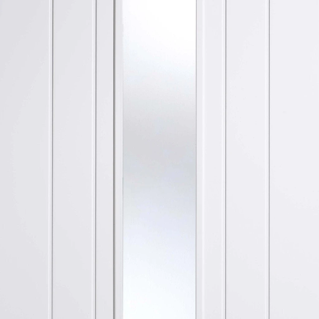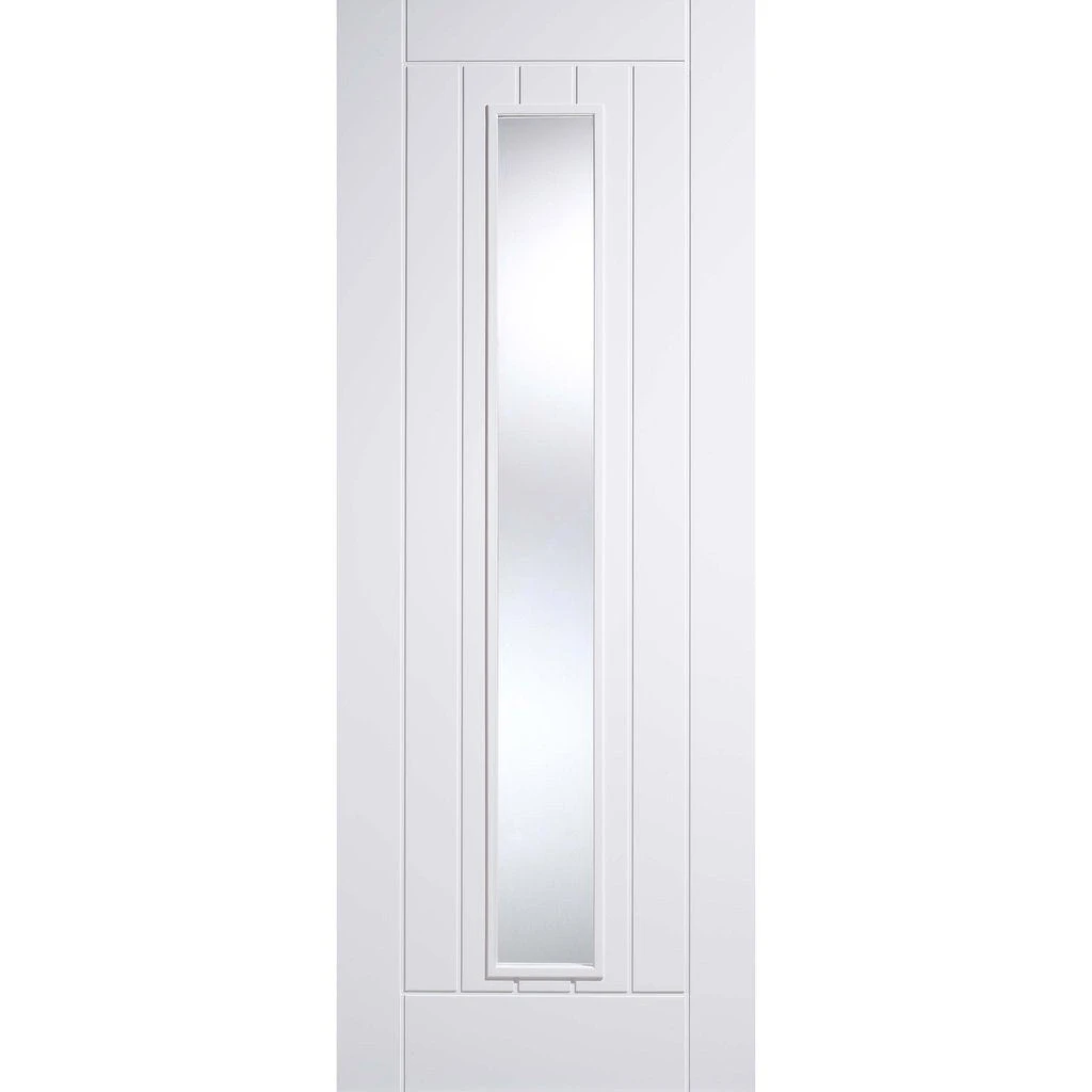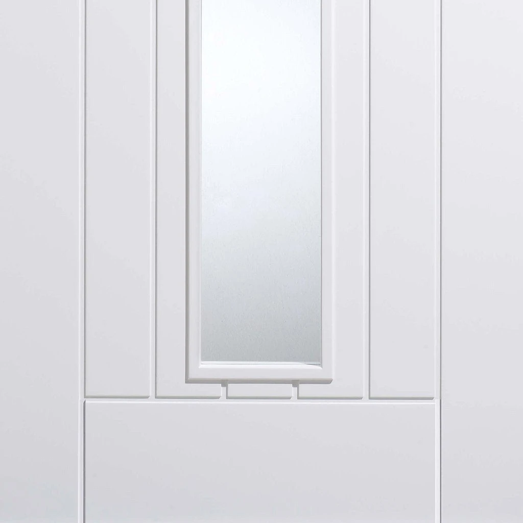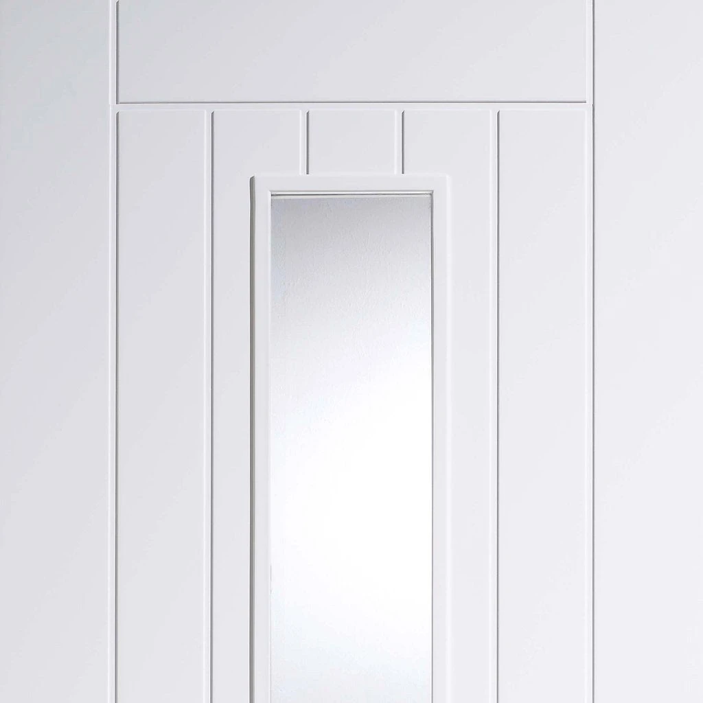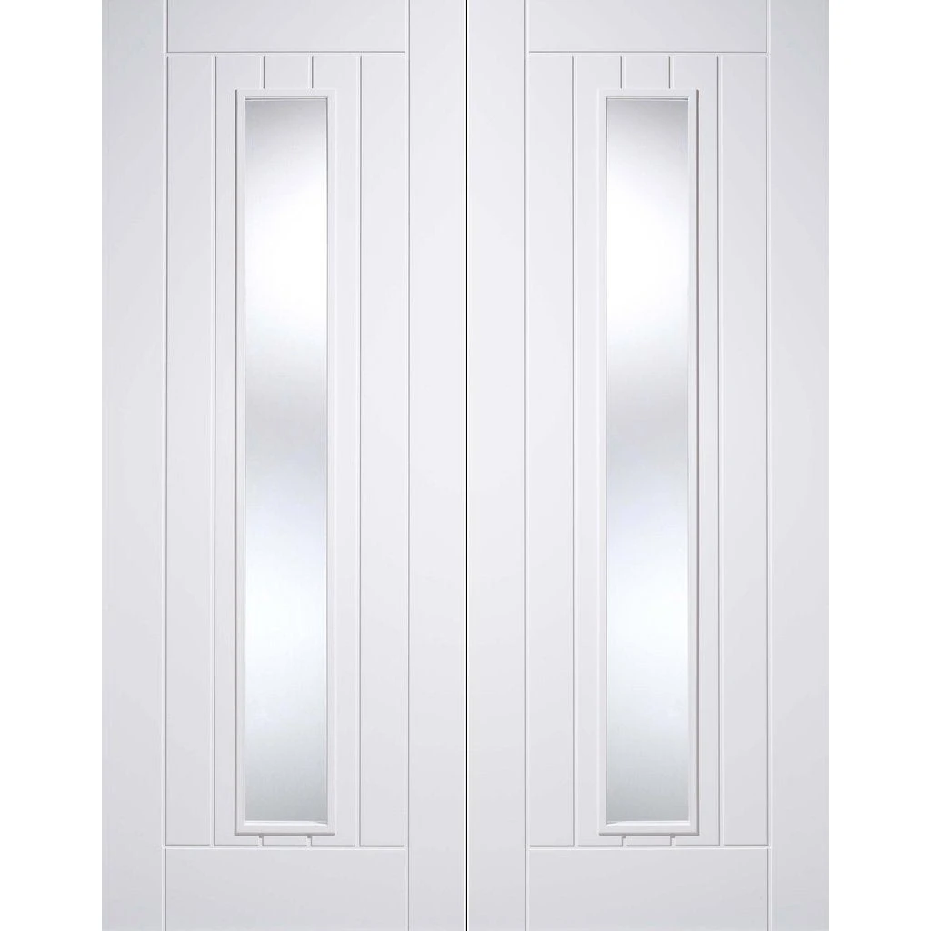 The Mexicano white primed door pair has a solid core with vertical lining effect, a smooth MDF face gives a great finish and is supplied primed white ready for your final coat of paint, the glass is clear and to safety standards.