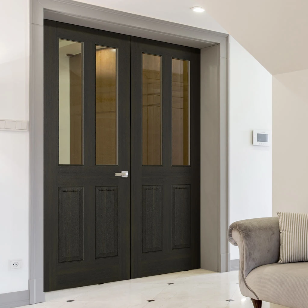 The fantastic Richmond Smoked Oak door pair with clear safety glass and raised mouldings and a modern colour veneer is fully prefinished.