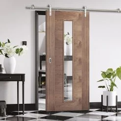 Saturn Tubular Stainless Steel Sliding Track & Sofia Walnut Veneer Door – Clear Glass – Prefinished