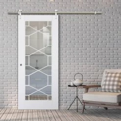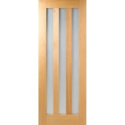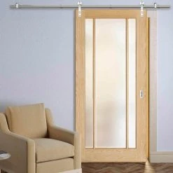 Saturn Tubular Stainless Steel Sliding Track & Lincoln 3 Pane Oak Door – Frosted Glass – Unfinished
