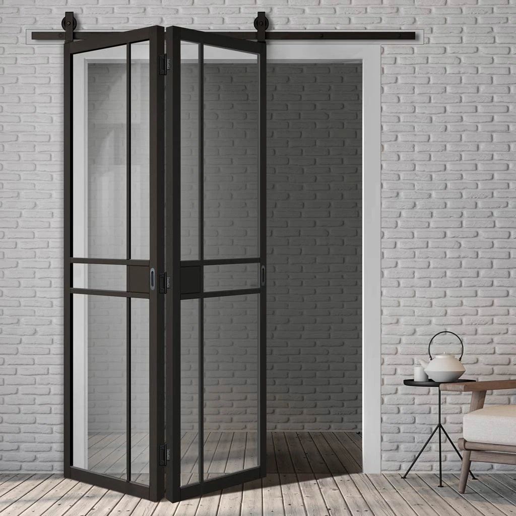 - A high quality top mounted folding/sliding track system finished in black, the top mounted track is screwed directly into the top of the door which gives the whole system a very sleek loft look.