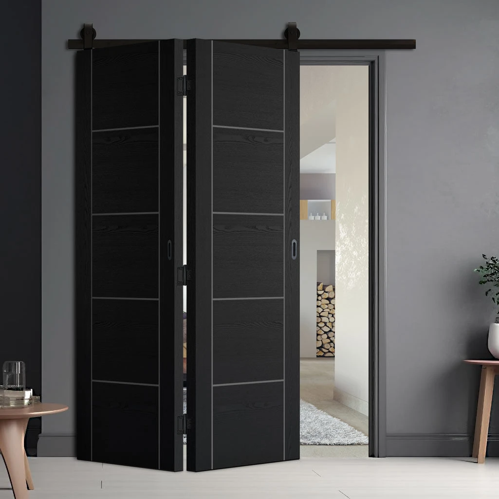 - A high quality top mounted folding/sliding track system finished in black, the top mounted track is screwed directly into the top of the door which gives the whole system a very sleek loft look.