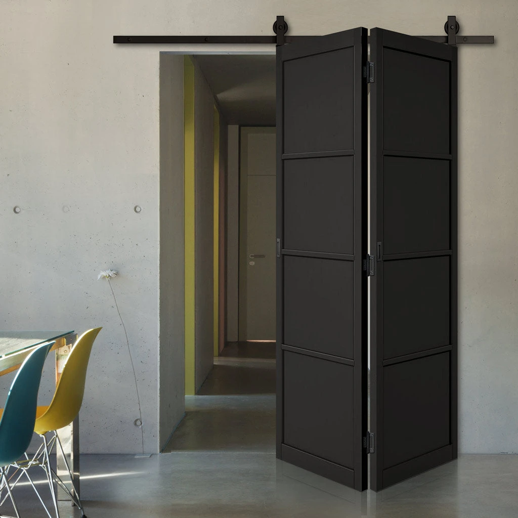 Elevate the efficiency and refinement of any room with the SpaceEasi Top Mounted Black Folding Track & Double Door – Soho 4 Panel Black Primed Door. This bifold barn track system provides a modern and industrial style solution, perfect for upgrading your space.