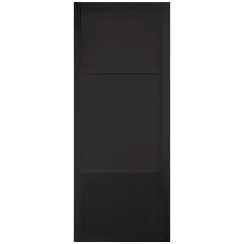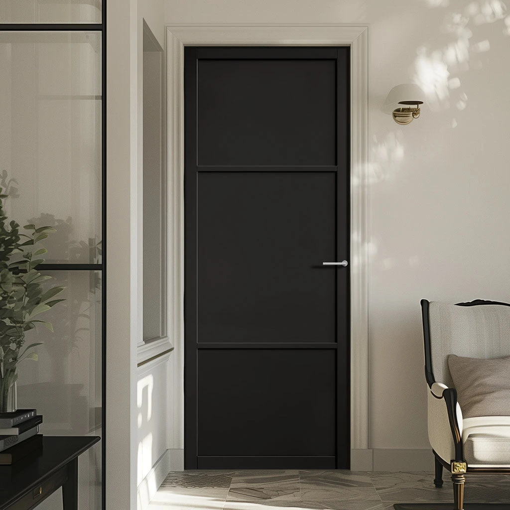 This prefinished Sutton Panel Black Internal Door boasts a striking industrial design with 3 panels, elevating the aesthetic of any interior space with a contemporary and refined touch.