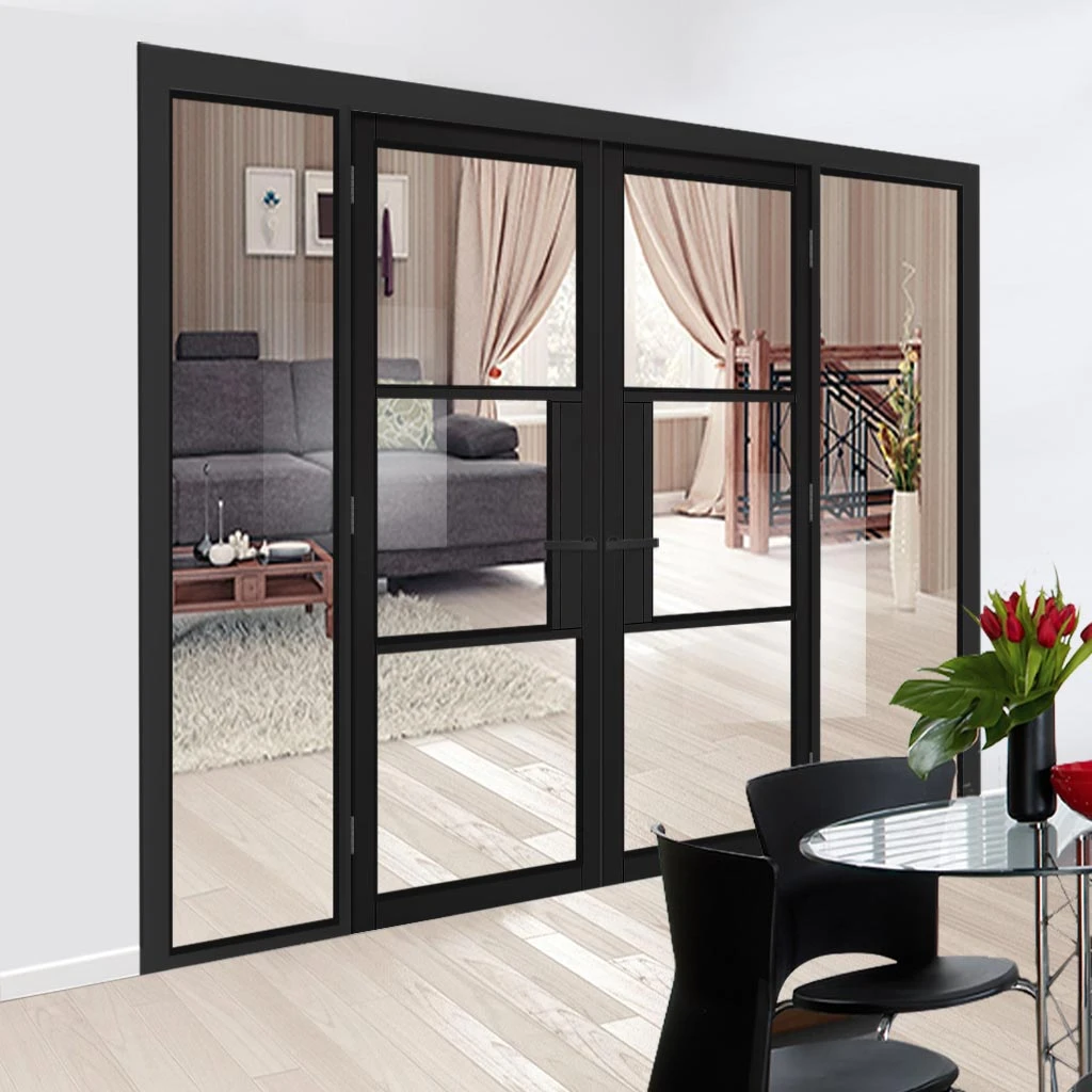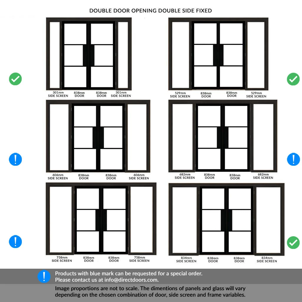 - Door position: Double doors are central with side inset screens on the right and on the left.