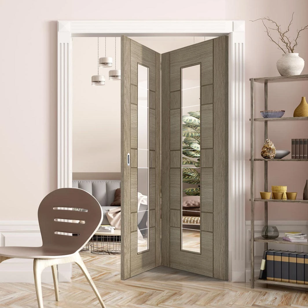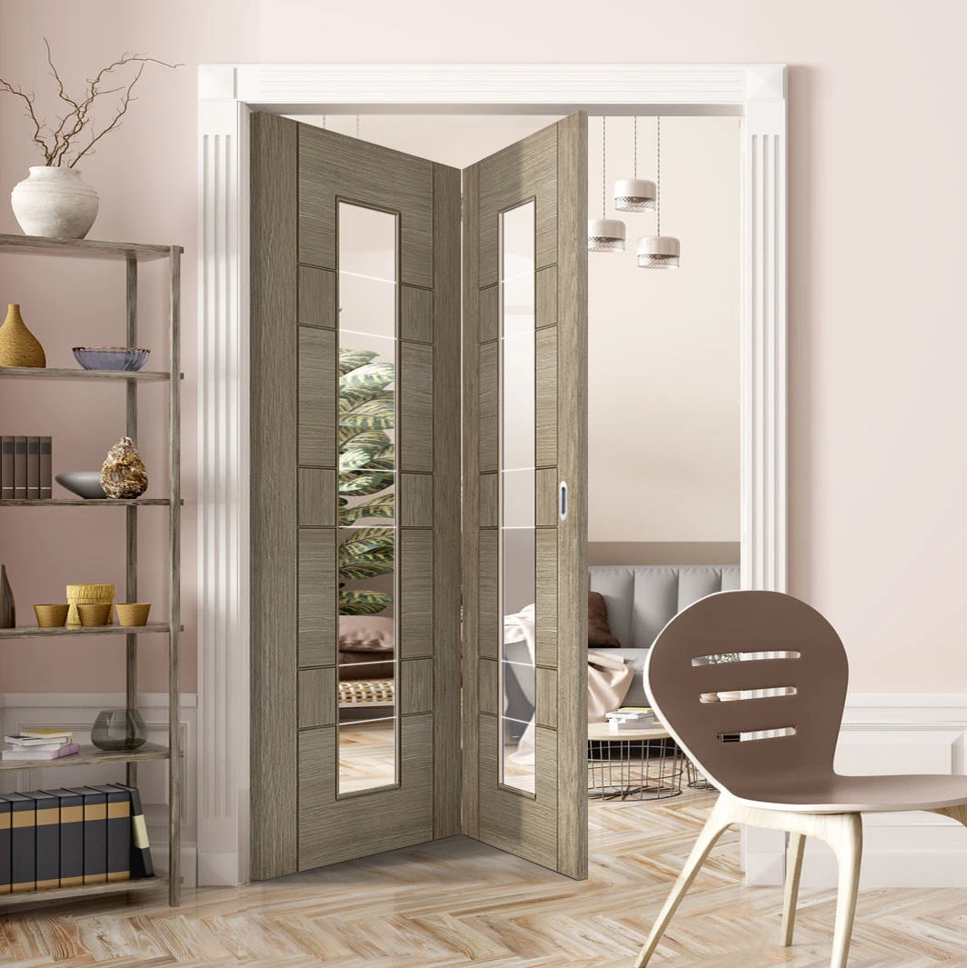 Two Folding Doors & Frame Kit - Edmonton Light Grey 2+0 - Clear Glass With Frosted Lines - Prefinished -LPD Door edmonton grey folding interior doors driectdoors modern doros 1